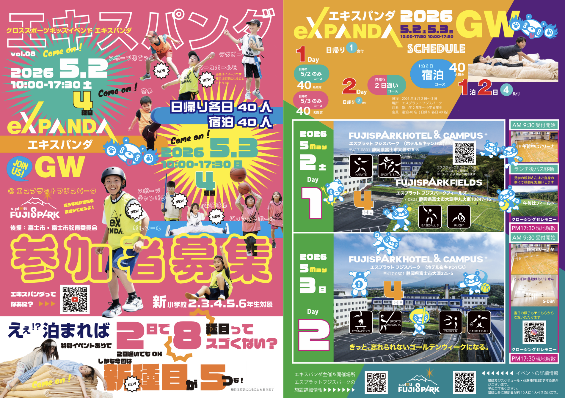 2026年のゴールデンウィークに富士スパーク(静岡県富士市)にて8種目のスポーツが体験できるマルチスポーツイベント「exPANDA(エキスパンダ)」にSpoglish CAMPとして参加いたします!Spoglish GYM代表の藤野と佐藤が責任を持って全行程を引率いたします。東京以外の子どもたちともスポーツを通じて交流できる貴重な機会となりますので是非ご参加ください!